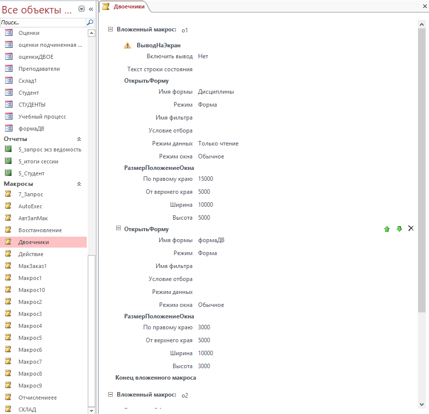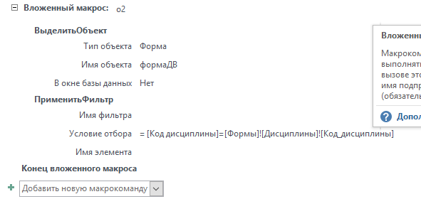 Во вложенном макросе о2 применяется фильтр. Он фильтрует записи о двоечниках по значению Код дисциплины, взятой из записи формы Дисциплины. В строке Условие отбора введем [Код дисциплины] =[Формы]! [Дисциплины]! [Код дисциплины]