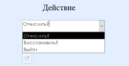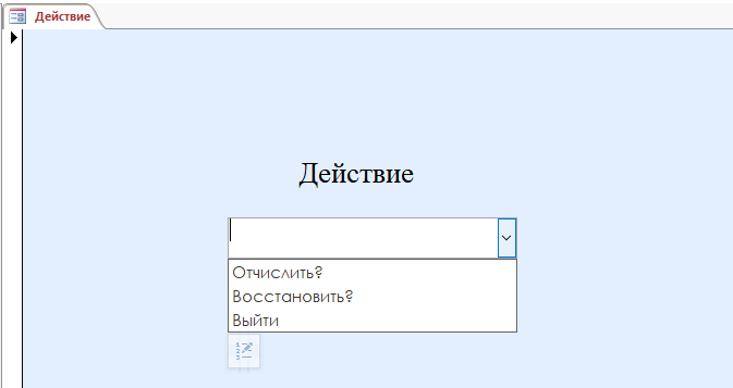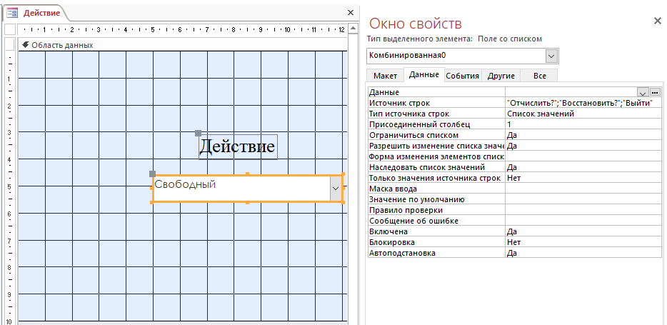 С помощью Конструктора форм, создаю форму «Действие». (Элемент управления: Поле со списком.)