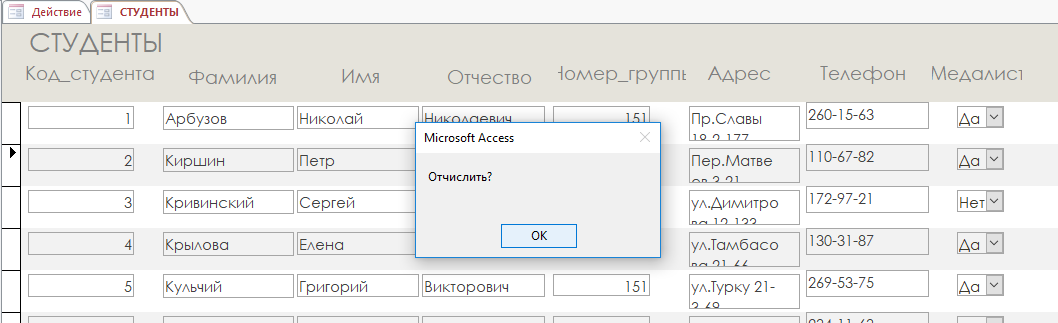 При двойном щелчке мышью по полю Код студента, открывается диалоговое окно. Отчисляем студента под кодом «2» - Киршина.