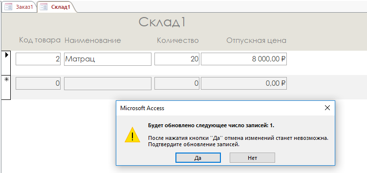 Создаю «запрос на обновление Склад» на основе таблицы «Склад». Для изменения записей в таблице.