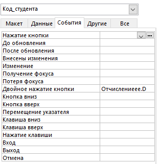 КЗМ поля Код дисциплины, свойства поля, вкладка События, вход- Двоечники7.о2
