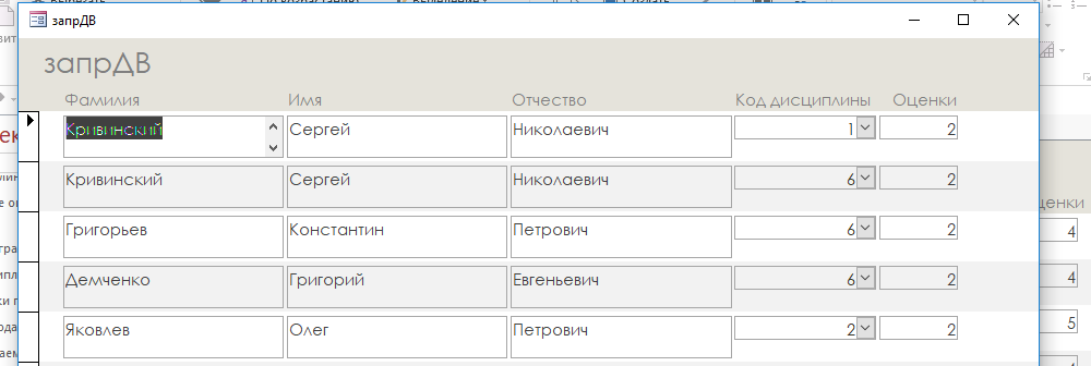 На основе запроса создается форма, отображающая студентов, получивших двойки.