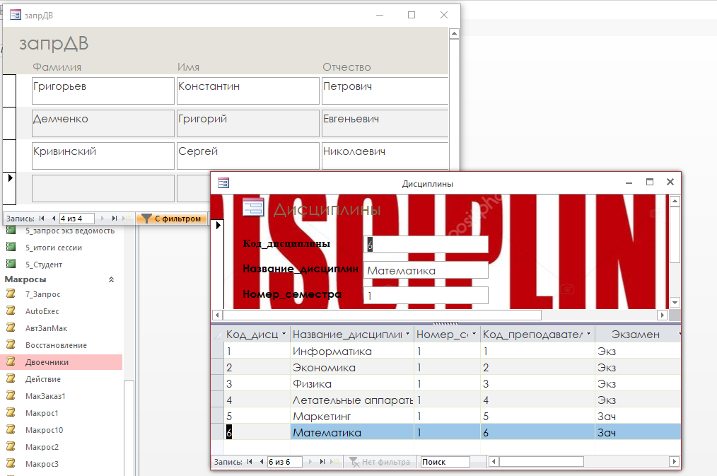 Чтобы формы Дисциплины и Двоечники открывались одновременно, необходимо в режиме Конструктора, в окне Свойств, на вкладке Другие, в строке Всплывающее окно, выбрать ДА.