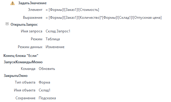 Теперь создаю макрос «Склад». И чтобы стоимость автоматически вычислялась нужно в форме Заказ1 в режиме конструктора открыть КЗМ поля Количество, вкладка Событие, Потеря фокуса – Склад.