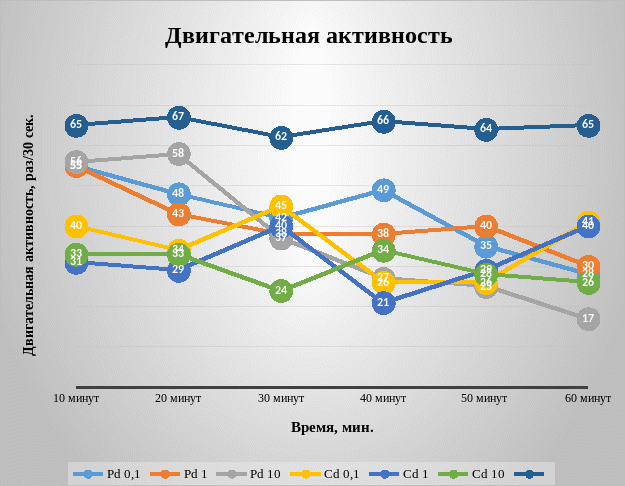 Измеряя двигательную активность дафний по сокращению их лапок была выявлена закономерность. На первых 10 и 20 минутах количество их движения не снижались и находись в районе о 45 до 58 раз за 30 секунд. После же 30 минут нахождения в растворах солей тяжелых металлов двигательная активность ветвистоусых рачков вида Daphnia magna Straus начала постепенно закономерно снижаться. Чем дольше данные особи находились в растворах солей, тем меньше становилась их двигательная активность. Активность ветвистоусых рачков вида Daphnia magna Straus в контрольном образце в обеих повторностях была высокой и составляла в среднем 63-68 раз за 30 секунд.