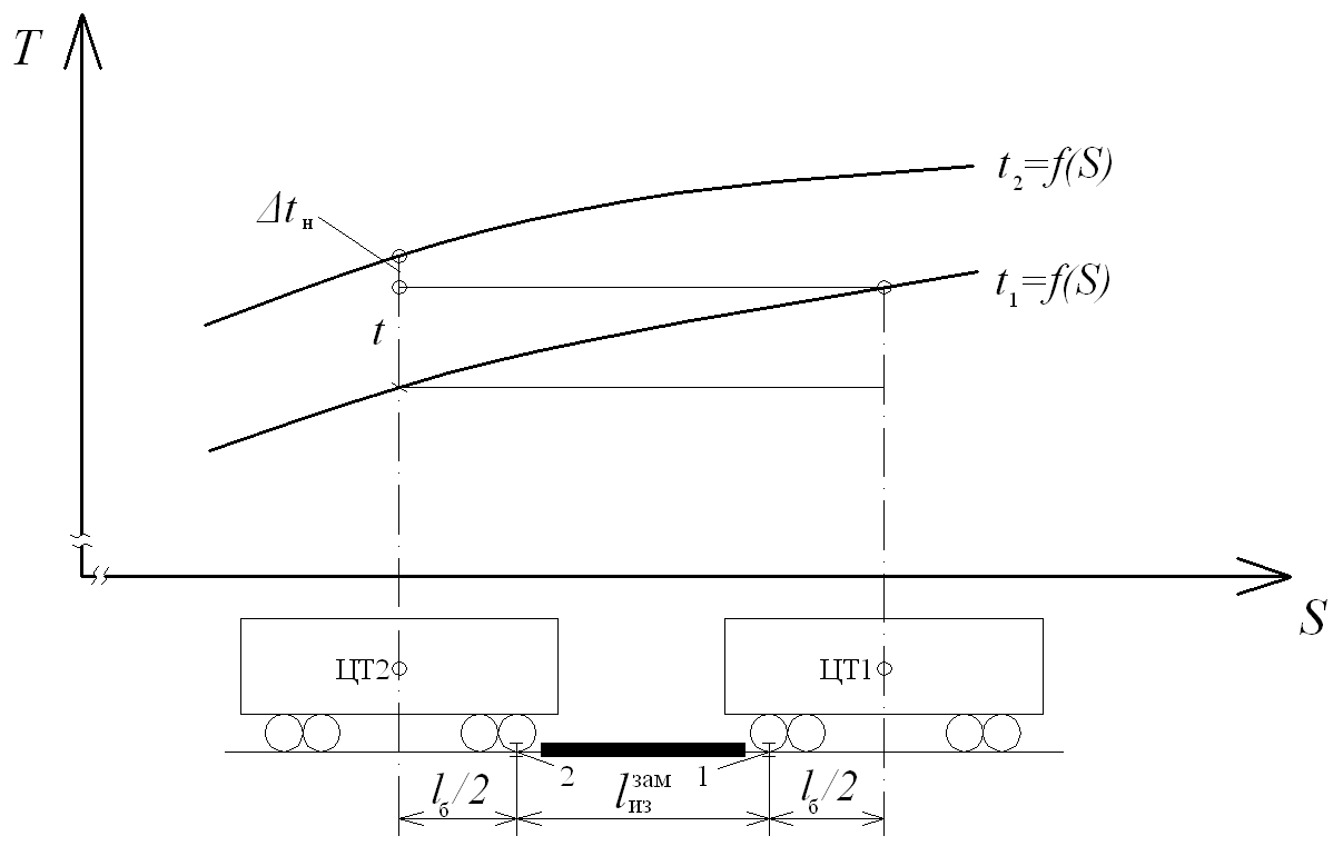 3) Проверка интервалов между смежными бегунами по предельному столбику. Анализ интервалов между РБ у предельных столбиков производится согласно схеме, приведенной на рисунке. Так как, по условию задачи расчетные бегуны 1 и 2 следуют на смежные пути сортировочного парка, которые соединяются тем стрелочным переводом, за которым находится рассматриваемый предельный столбик. В тот момент, когда задняя автосцепка расчетного бегуна 1 зашла за предельный столбик в сторону сортировочного парка, передняя автосцепка расчетного бегуна 2 должна находиться за предельным столбиком в направлении вершины горки на таком расстоянии, которое обеспечивало бы резерв времени не менее, чем = 1 с.