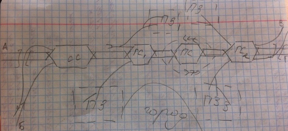 Преимущества: узел имеет высокую пропускную способность при пропуске прямого транзита по линиям ГВ, ВА.
