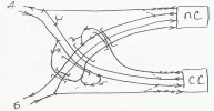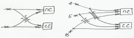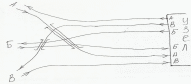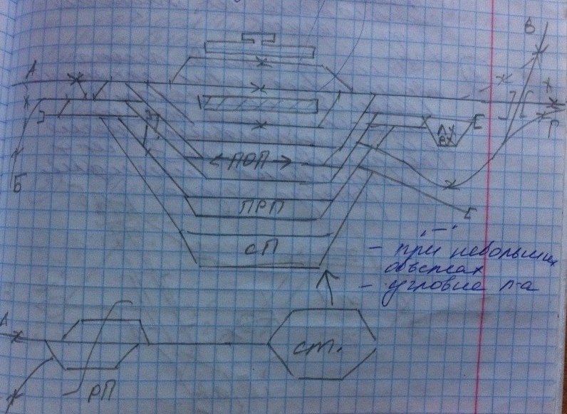 Узлы крестообразного типа образуются при схождении линий под углом близким к 90 и при отсутствии значительной корреспонденции между сходящимися линиями (Пенза, Тула). Основной недостаток – сложность пропуска поездов с В на Б, с Б на В, с А на Б. Такие поезда проходят через уезел с угловым заездом. С подхода Б принимается на ст.1, меняется голова поезда и отправляется на В. Поскольку в узле проектируются 2 станции, возрастают капит затраты, расходы по содержанию штата.