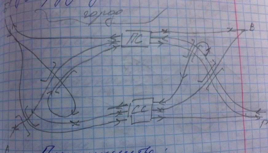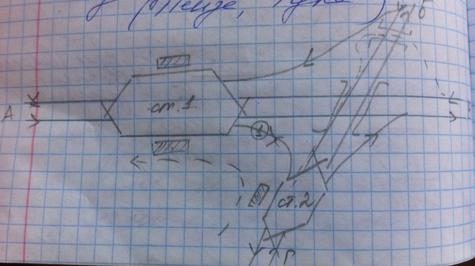Расположение станций в узле. Если имеются разные варианты размещения и специализации станций в узле по роду движения , то схема развязок тоже будет отличаться. На СС, как правило, однопутный подход располагается внутри, а пути приема и отпр двухпутки – снаружи. Это позволяет сократить враждебность маршрутов в горловине СС. На ПС, если это упрощает схему развязки, однопутка может располагаться сбоку. В этом случае параллельность обеспечивается за счет конструкции горловин ПС.