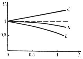 При активной нагрузке при увеличении тока нагрузки Iа напряжение на выходе генератора уменьшается вследствие падения напряжения на внутреннем сопротивлении машины za=ra+jxa и влияния поперечной реакции якоря. При индуктивной нагрузке за счет более сильного за счет более сильного размагничивающего действия продольной реакции якоря внешняя характеристика при чисто индуктивной нагрузке идет ниже внешней характеристики при активной. При емкостной нагрузке реакция якоря подмагничивающая, поэтому с ростом нагрузки растет напряжение на выводах генератора.