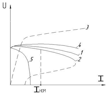 Внешние характеристики генераторов: 1 – с независимым возбуждением; 2 – с параллельным; 3 – с последовательным; 4 – со смешанным включением при согласном включении обмоток; 5 – то же при встречном включении обмоток.