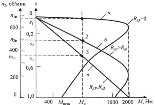 Как следует из этого уравнения, добавочное сопротивление в цепи обмотки ротора увеличивает критическое скольжение и не влияет на значение максимального момента Мк