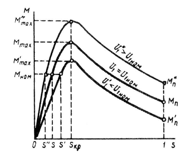 Из приведенных выше характеристик четко видно, что скольжение асинхронной машины не зависит от изменений питающего напряжения. Устойчива работа электропривода возможна со статическим моментом только на участке от синхронной скорости до критического скольжения (sк). Соответственно при снижении напряжения питания эта зона существенно снижается. Также у асинхронного электродвигателя значительно снижается пусковой момент, что делает невозможным его запуск с номинальным моментом при значительном снижении напряжения питающей сети.