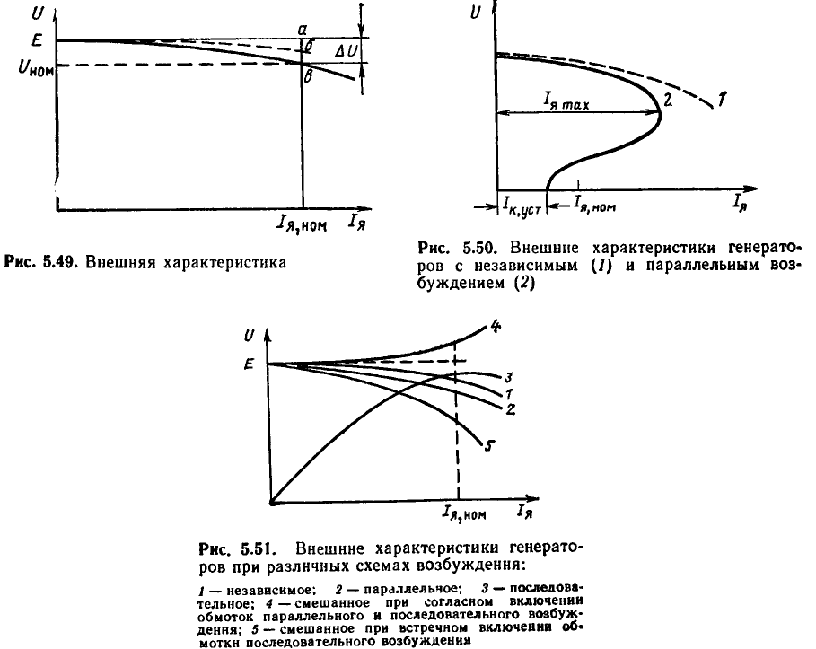 Внешняя характеристика генератора последовательного возбуждения (кривая 3) имеет вначале линейный участок, а при токах, близких к номинальному, наступает насыщение и рост напряжение замедляется. При согласном включении обмоток возбуждения напряжение растет с ростом нагрузки (кривая 4). При встречном включении обмоток внешняя характеристика мягкая (кривая 5)