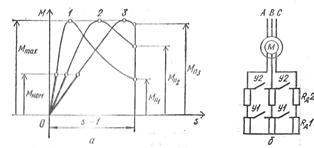 Введение в цепь ротора двигателя регулируемых резисторов, называемых пусковыми, не только снижает начальный пусковой ток, но одновременно увеличивает начальный пусковой момент, который может достигнуть максимального момента Mmax (рис. 1, а, кривая 3), если критическое скольжение двигателя с фазным ротором