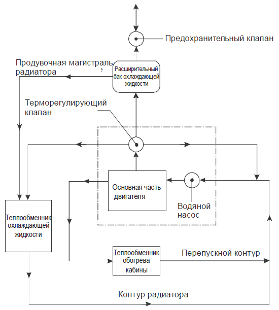 Перепускной контур оснащен теплообменником «охлаждающая жидкость — воздух» (теплообменником обогрева кабины), который обеспечивает подогрев воздуха для системы обогрева кабины. Для компенсации расширения и регулирования давления охлаждающей жидкости предусмотрен расширительный бак. Для защиты системы охлаждения от высокого давления установлен предохранительный клапан.