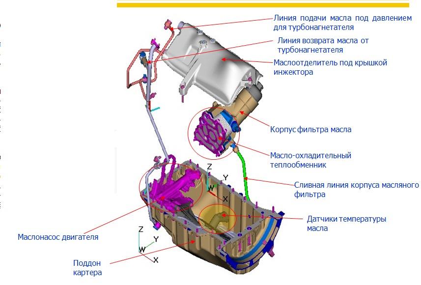 Масло двигателя до применения для смазки проходит прямо к внутреннему масло-охладительному теплообменнику. Выполнив смазку внутренних компонентов двигателя, масло без давления возвращается в поддон картера двигателя.