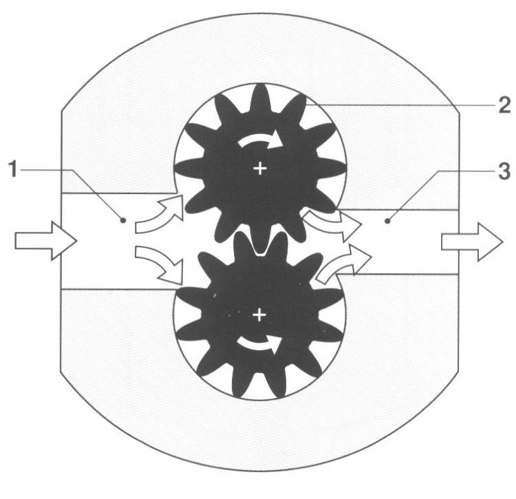 1 – вход в насос; 2 – ведущая шестерня; 3 – выход из насоса