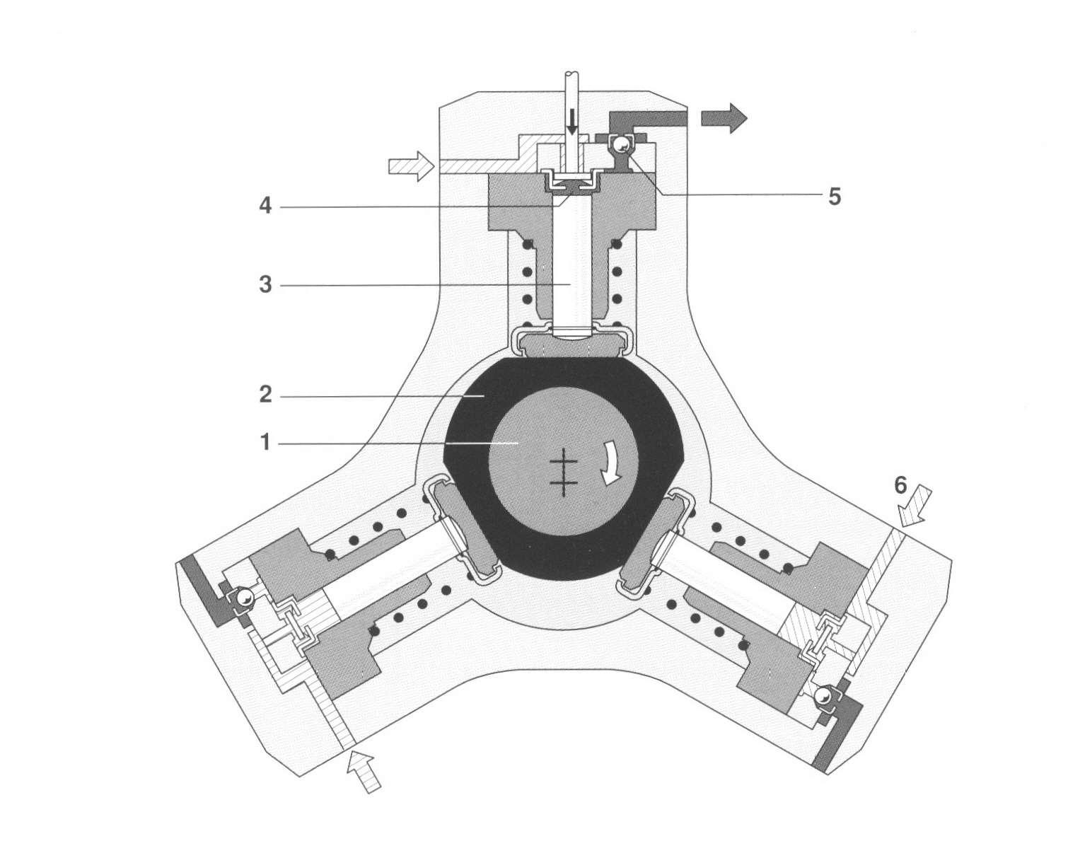 1 – вал; 2 – кулачок; 3 – толкатель; 4 – корпус; 5 – выход из насоса; 6 – вход в насос