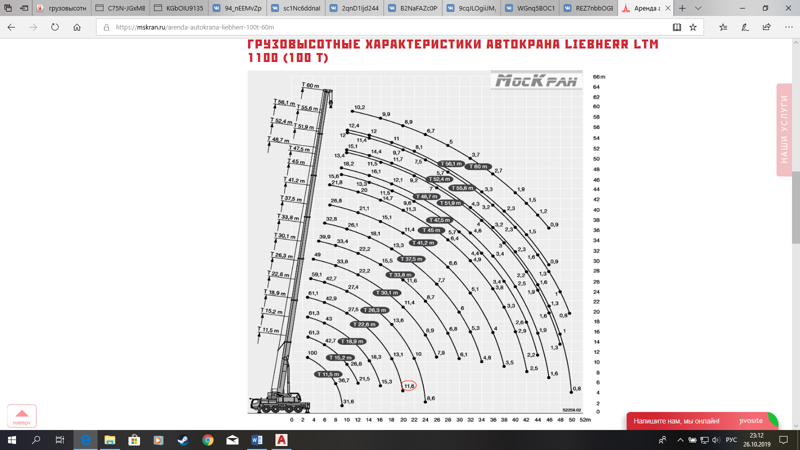 Для производства монтажных работ выбран мощный и достаточно дорогой кран Liebherr 100 т с основными грузоподъемными характеристиками: