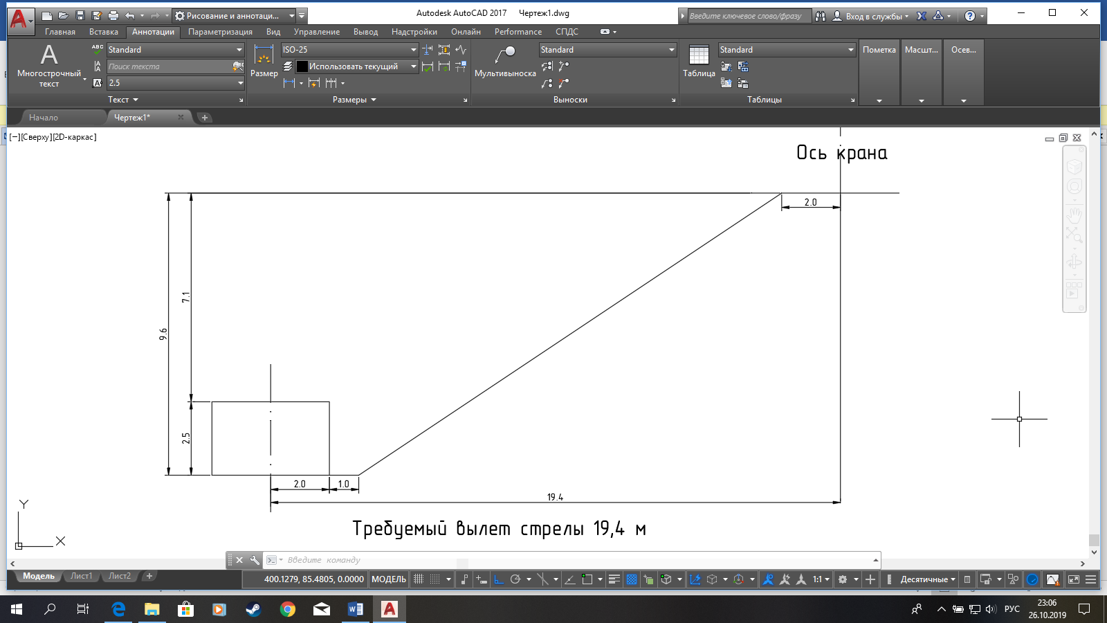 Рис. 1 Схема определения минимального вылета стрелы крана