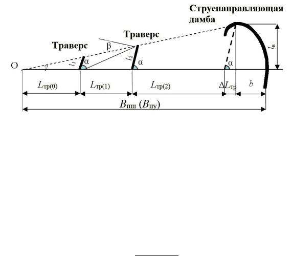 Отношение длины каждого последующего траверса ln к длине предыдущего ln–1, которое для рассматриваемой конфигурации регуляционных сооружений является величиной постоянной, определяется по формуле