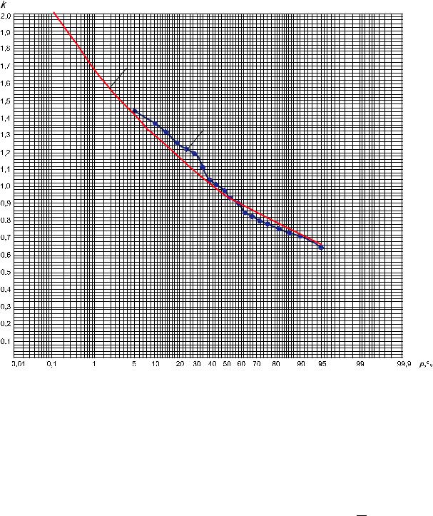 На клетчатке вероятности по оси абцисс указывают значения вероятности р в процентах, а на оси ординат – модульные коэффициенты k. При этом следует учитывать диапазон изменений величин модульных коэффициентов ki (в рассматриваемом примере ki см. в графе 5 табл. 4), который изменяется от 0,6729 до 1,4333. Максимальное значение на шкале модульных