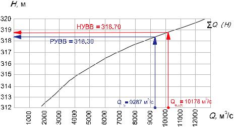 По графику зависимости ΣQ(H) определяют уровни воды требуемой вероятности превышения в створе водомерного поста, соответствующие максимальным расходам (рис. 6):