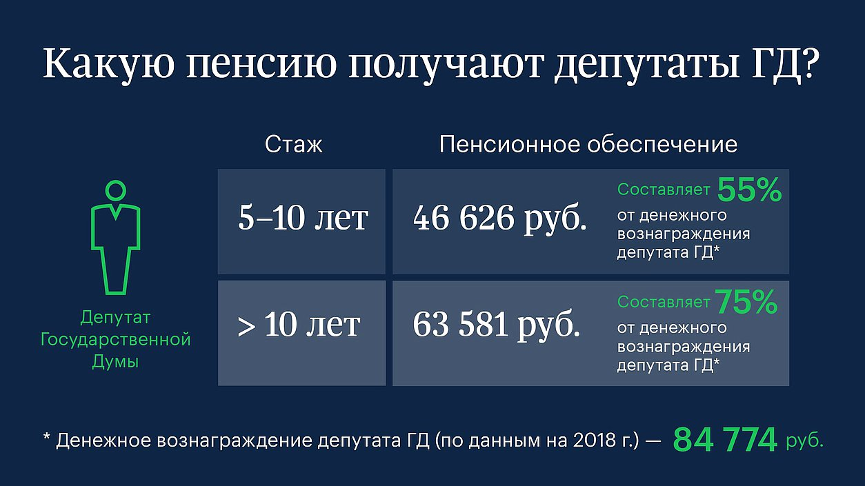 ● при стаже свыше 10 лет — 75% денежного вознаграждения депутата Государственной Думы.