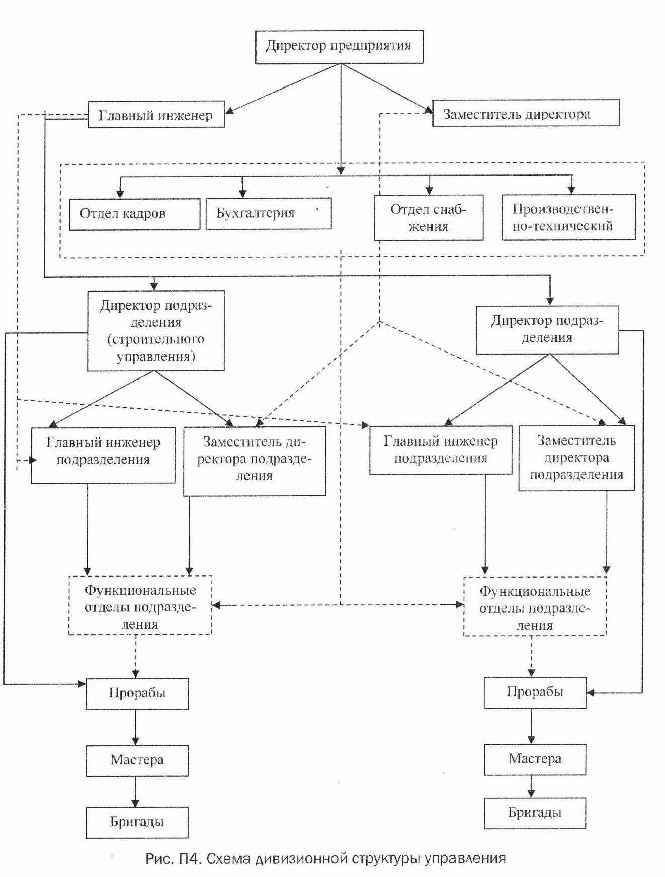 Основу дивизионной структуры составляет так называемый «шахтный» принцип построения и специализации процесса управления. По каждой из функциональных служб (отделы: снабжения, плановый, производственный и т. д.) формируется иерархия («шахта»), пронизывающая всю организацию сверху донизу. При этом аналогичные отделы образовываются как в аппарате управления строительного предприятия, так и в аппаратах управления его самостоятельных подразделений (отделений).