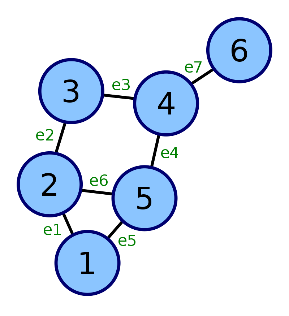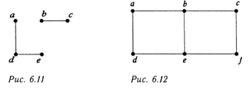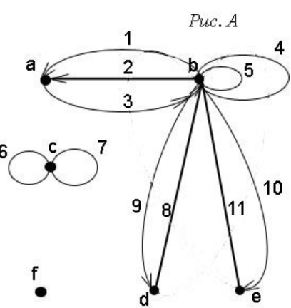 Итак, задаём граф следующими множествами: множество вершин: V = {a, b, c, d, e, f} множество рёбер: U = {1, 2, 3, 4, 5, 6, 7, 8, 9, 10, 11} множество инциденций: P = {(b, 1, a), (b, 2, a), (a, 3, b), (b, 4, b), (b, 5, b), (c, 6, c), (c, 7, c), (b, 8, d), (d, 8, b), (b, 9, d), (b, 10, e), (b, 11, e), (e, 11, b)}