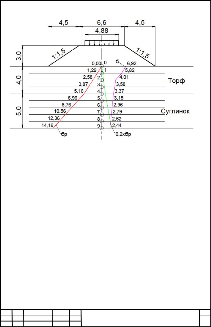 Если на поверхности слоя торфа приложить нагрузку = 2,82 т/м 2, на нижней грани слоя по оси симметрии вертикальные нормальные напряжения составят: