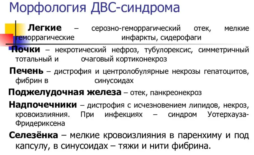 иммунные и иммунно-комплексные болезни (ревматические, ГН) Патогенез: активация полисистемы гемостаза экзо- и эндогенными факторами → рассеянное внутрисосудистое свертывание крови и агрегация форменных элементов преимущественно в МЦР → активация плазминовой, калликреин-кининовой и комплементарной систем → вторичная эндогенная интоксикация продуктами протеолиза и деструкции тканей → геморрагический синдром из-за микроциркуляторных расстройств, потребления факторов свертывания крови, тромбоцитопении и тромбоцитопатии, накоплений продуктов протеолиза → альтеративные (дистрофия, некроз) изменения различных органов и тканей из-за расстройств гемодинамики и блокады сосудистого русла агрегатами форменных элементов крови, микротромбами