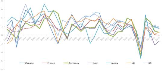 the graph, it can be concluded that the rate of Real GDP is quite unstable and fluctuates through the time. In addition, the highest volume and a huge decrease of GDP were in Canada.