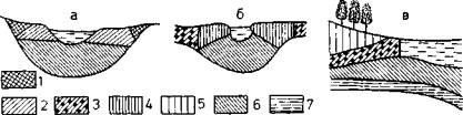 а — в водоеме с минерализованной водой; б — в водоеме с мягкой слабоминерализован ной водой; в — в водоеме с неминерализованной водой; 1 — древесно-осоковый торф; 2 — осоково-ситниковый торф; 3 — осоково-шейхцериевый торф; 4 — тростниковый торф; 5 — сфагновый торф; 6 — смешанно-водорослевый сапропель; 7 — глинистый сапропель