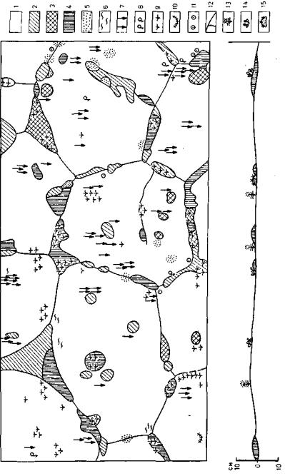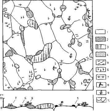 Рис. 13. Горизонтальная и вертикальная структура полигональной лишайниковомоховой пустыни. Размер площадки 1X2 м (Н.В.Матвеева, 1979):