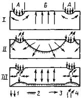 мохпвой растительный покров; 2 — уровень от таивания мерзлоты; 3 — направление движения влаги и водорастворимых соединений; 4 — поверхностный сток или горизонтальное надмерзлотное элювиирование