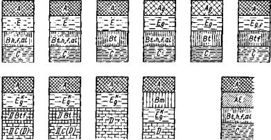 Рис. 21. Схемы строения разных типов элювиально-иллювиально-дифференциро-