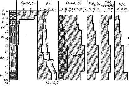 Рис. 23. Профильная характеристика подзолистой (дерново-подзолистой) почвы под лесом (по данным В. В. Пономаревой)