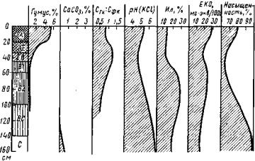 Наиболее кислая реакция характерна для светло-серых почв, где рН солевой вытяжки находится в пределах 4,3—4,5 у серых лесных почв 4,6—5,2. Наименее кислая реакция наблюдается в темно-серых лесных почвах, где рН 5,2—6,4. Степень насыщен ности почв основаниями наименьшая у светло-серых лесных почв (59—63%) и наиболее высокая у темно-серых лесных почв (77—96%). Содержание обменного кальция в почвенном поглоща ющем комплексе светло-серых лесных почв низкое, всего 7,0— 11,0 мг-экв/100 г в горизонте А, с резким падением вниз по про филю; в темно-серых лесных почвах повышается до 20—25 мг-экв/