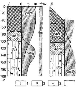 Структура профиля южного чернозема имеет вид А (Ар + А)- АВ (ABca)-Bca-BCca-Cca-Ccs-Csa.