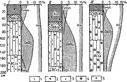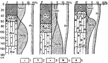 теплых промерзающих и умеренных промерзающих почв; II — фации очень теплых пе риодически промерзающих почв; III — фации умеренных длительно промерзающих почв. Карбонатные и гипсовые выделения в профиле: 1 — прожилки; 2 — псевдомицелий; 3 — бе логлазка; 4 — мучнистые скопления; 5 — кристаллы и друзы гипса