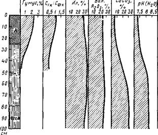 Содержание гумуса невелико: в верхнем горизонте 2—5% на целине и 1,5—3,5% на пашне. В то же время гумусовый профиль мощный; в горизонте метаморфического оглинивания количество гумуса составляет 1 —1,5%. В составе гумуса содержание гуминовых кислот и фульвокислот одинаковое. Гумус обогащен ве