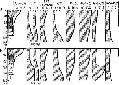 Рис. 56. Профильная характеристика ферраллитной недифференцированной поч вы (А) и той же почвы с латеритом (Б)