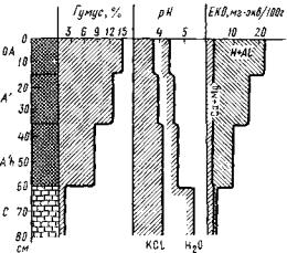 Особенности этих почв связаны со спецификой их гумуса и вы сокой ожелезненностью и алюминированностью (до 30—70% валового содержания F2 О3 и Аl2О3 переходит в 0,1 н. сернокислотную вытяжку). Содержание гумуса составляет 5—13% в горизонте А' и 4—8% в горизонте A'h. В составе гумуса характерно преобладание гумусовых кислот при малом нерастворимом остатке, а среди гу мусовых кислот преобладают фульвокислоты, особенно в нижней части профиля; характерна общая высокая мобильность, потечность гумуса. Почвы сильно кислые, ненасыщенные, при емкости катионного обмена 10—20 мг-экв/100 г (рис. 5).
