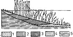 Рис. 8. Заболачивание водоема путем зарастания (по В. Н. Сукачеву, 1926): 1 — осоковый торф; 2 —тростниково-ро- гозовый торф; 3 — торфянистый сапро пель; 4 — смешанно-водорослевый сап