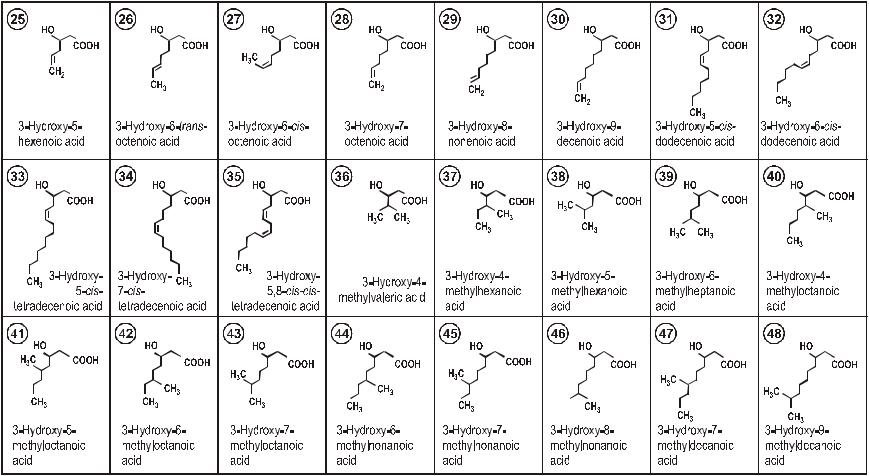 Д) 3-оксикислоты с различными функциональными группами, образованными в R-боковых группах, включая свободные карбоксильные группы, такие как яблочная кислота (#50), карбоксильные группы, этерифицированные с алкильными группами (от # 51 до #58) или бензойную кислоту (#59); ацетоокси группы (#60, #61), связанные с R-боковыми группами и феноксигруппами (от #62 до#65), para- цианофенокси группы (от #66 до #68) или para-нитрофенокси группы (#69), связанные с R-боковыми группами (#70) или циклогексильной группой (#71) с основной углерод-углеродной связью. Кроме того, обнаружены оксикислоты со второй оксигруппой ((#72, #73) или с эпокси группой (от#74 до #76), а также другие типы ПОА, содержащие ω-углеродный атом оксикислоты с включенной цианогруппой (#77, #78) или атомы галогенов – такие, как флюорин (#79, #80), хло-