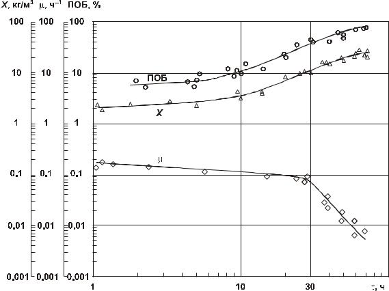 Рис. 2.6. Динамика урожая X, концентрации полиоксибутирата и удельной скорости роста |