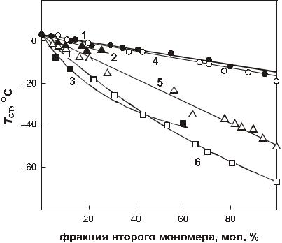 Температурные свойства полиоксиалканоатов и кинетика кристаллизации определяют базовые физико-механические свойства. Включение в полимерную цепь 3-полиоксибутирата оксипроизводных жирных кислот различной структуры в качестве вторых сополимерных единиц кардинально меняет физико-механические свойства материала (Doi, 1990; Holmes, 19981). Семейство синтезированных и описанных к настоящему моменту ПОА включает как высококристалличные плотные полимеры, так и мягкие резиноподобные эластомеры. В принципе, большинство гетерополимерных полиоксиалканоатов являются термопластичными материалами. Однако температура плавления у различных типов ПОА варьирует от 50 до 180 С. Так, температура стеклования ПОА различного строения в зависимости от мономерного состава варьирует в широких пределах (рис. 3.24).