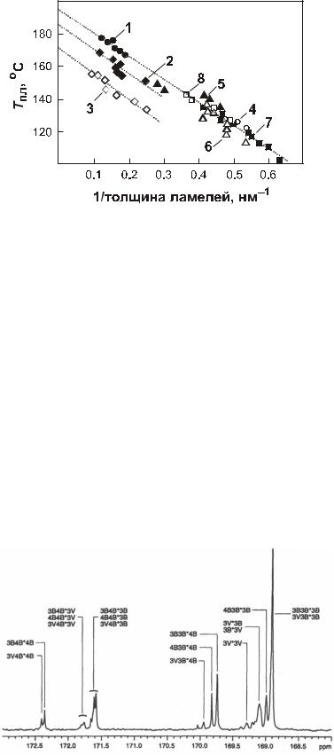 плавления. У 3-ПОБ данная зависимость линейна; у сополимера оксибутирата с оксивалератом, имеющего более низкую температуру плавления, зависимость меняется в сторону снижения температуры при сходной толщине ламелей с увеличением доли оксивалерата. У другого типа материала – сополимеров оксибутирата с оксигексаноатами – область зависимости температуры плавления от обратной величины толщины ламели экстраполируется имеющейся зависимостью, полученной для гомополимера 3-оксибутирата, у которого более тонкие ламели.